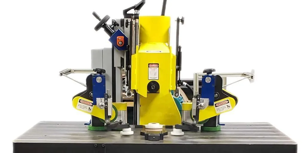 The FAS-HD 8 " Universal Arch Moulder is equipped with two axis spindle adjustment, and spindle tilt in order to easily and accurately match the cutter to the moulding profile. The spindle adjustment and floating feed simplify the cutting of circular/elliptical profiles, straight casing, and crowns.