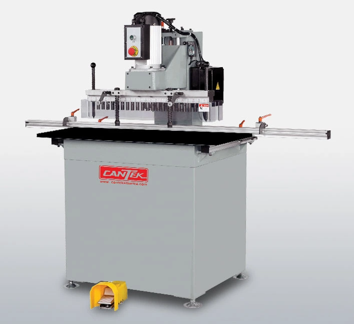 The Cantek JB21P Line Boring Machine is designed to speed up your line drilling operations. It has a total of 21-spindles based on a 32mm centers. The spring-loaded index pin allows for accurate and convenient continuous line drilling operations. The precision rear aluminum fence with linear scale and (2) flip stops allow for precise and convenient setup. The complete back fence can be adjusted for various measurements from the edge of the panel to the holes. The precision boring head has interlocking steel gears with alternating spindles and accepts industry standard boring bits with 10mm shank. The convenient foot pedal initiates the drilling cycle so your hands can quickly adjust the workpiece to the next operation. The drilling unit moves up and down on high carbon anti-friction steel shafts with linear bearing for effortless movement.