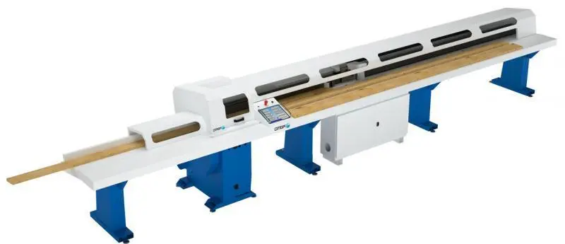 A pneumatic tail clamp system ensures the accurate handling of the boards, during the positioning in between each cut. Two horizontal clamps self-adjust based on the cross section of the workpiece and ensure that the board is square against the fence before each cut. The marking of the defects is done through a fluorescent crayon. The phase of reading the defect marks and length of the board occurs automatically, during the return stroke of the pusher. The NC controller associated with the industrial 10.4" touch screen PC allows for easy data entry as well as an intuitive means to access all the optimization programs. A USB port, as well as an Ethernet RJ45 port, allows the connection to company networks. The statistical data on the program being executed are always available to view by the operator, without interrupting the cycle of the machine. The T 523 OPT is capable of handling three different grades of material simultaneously.