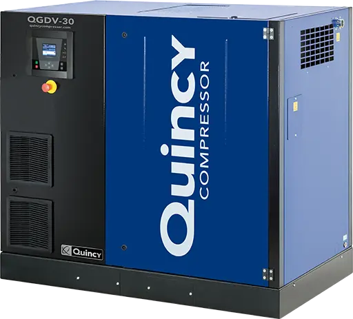 The Quincy QGDV series is a high performance variable speed rotary screw compressor package that can be used in a wide range of applications. All QGDV units from 15 horsepower to 30 horsepower feature industry leading efficiency and serviceability. The models can be configured as basic units or can be equipped with some basic options to best fit your application. All QGDV models have low sound levels, small footprint and the lowest total cost of ownership in the industry.