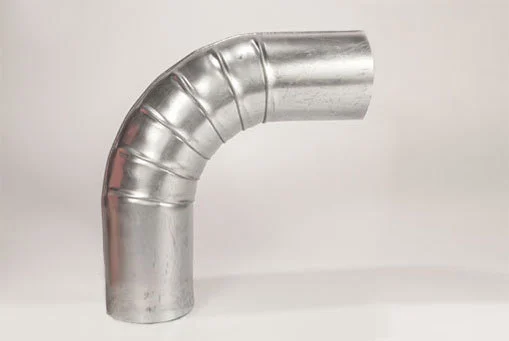 These elbows are made by bending and pleating a piece of duct. The non-welded style starts with an un-joined piece of duct and as the pleating takes place, the overlapping edges are pressed together on the inside of the elbow. The welded elbow starts with a piece of duct that has been continuously welded down the seam. The duct is formed the same way but the weld is on the outside radius.