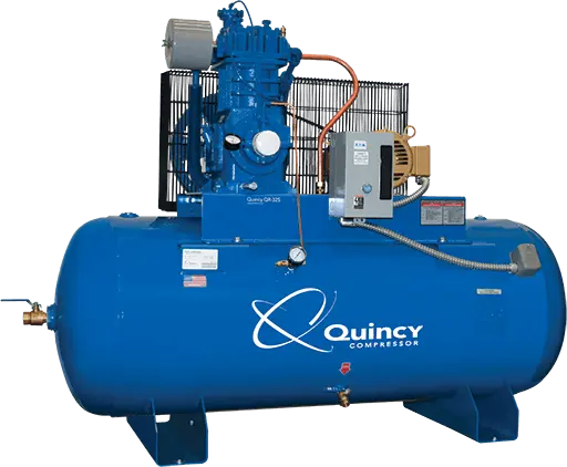 The Quincy Pressure Lubricated Reciprocating/Piston Air Compressor QR-25 is their premium, top-of-the-line pressure lubricated piston air compressor. It’s a heavy-duty compressor that is pressure lubricated in all critical areas and delivers up to 25 HP. Available in single- and two-stage versions, the QR-25 is designed to operate at slower speeds and is equipped with intake loaders that minimize work. The rugged cast iron construction ensures a long life expectancy, less downtime and easier maintenance. Other key features include loadless starting, a manually reversible oil pump and rebuildable components. Seen as the industry standard in piston compressor technology, the performance of Quincy’s QR-25 is legendary.