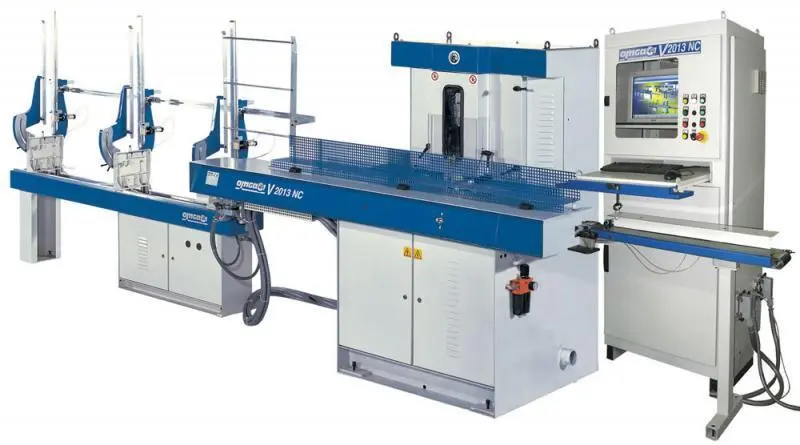 The V 2013 NC is an integrated system for elevated production of picture and photo frames as well as any other component which is assembled by way cutting the ends at an angle. Sophisticated, but simple and practical, the system is fitted with a guidance computer (PC) which makes the machine more productive and flexible, for an improved quality of the finished product. The machine counts with a hopper feeder (available in both Horizontal and Vertical versions) which allows it to function completely unattended. The following are some of the key features of the V 2013 NC Fully Automated Mitering System: Optimized Cutting By inputting the data relating to the length of the moulding along with the cutting list, the machine is able to select the best sequence automatically, maximizing the material's yield. Higher Production The high speed feed carriage allows large scale production in any circumstance. The zero setup time for changes in the cutting list, is another important factor in the high performance of this unique system. Depending on several variables the output of the system ranges from 1000 to 1500 pieces per hour. Data Storage The computer has down loading capability through the 3 1/2" floppy disk or direct cable connection via RS 232 port. It is possible to interrupt the cutting process at any time and have a different program carried out, while all the data relating to the first program including the number of pieces still to be executed remain stored. Easy User Interface The onboard computer is equipped with an 8" monitor which allows all the messages that the operator requires, to be fully and constantly displayed in the desired language. A step by step full graphic display makes it easy for the operator to select the required operation. The on the screen diagnosis, reduces needless down time due to electric or pneumatic failure. Flexibility The angle of the 2 saw blades is automatically adjusted by the computer based on the programmed type of frame (Square, Rectangular, Hexagonal or Octagonal), all calculations or consequently optimized according to the chosen angle (90, 30 or 22 1/2 degrees).