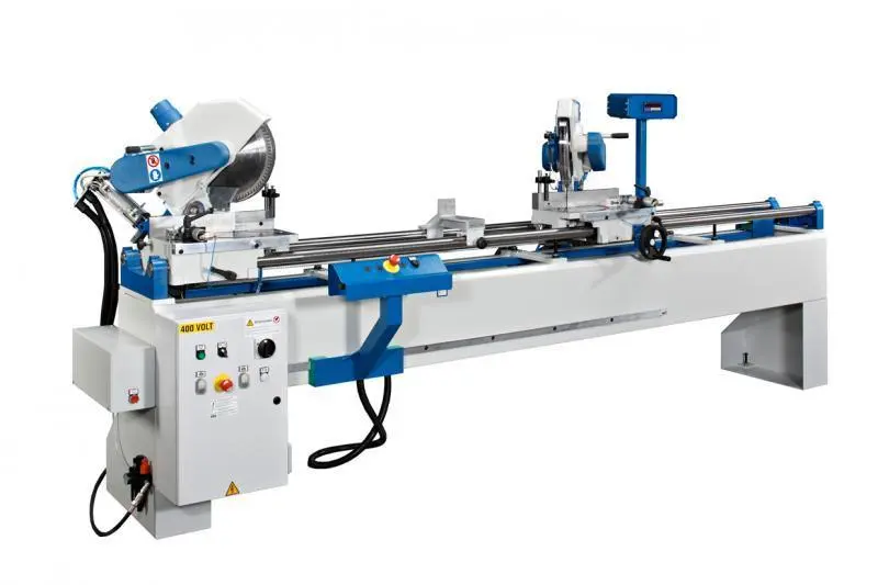 Last generation 14" Compound Double Mitre Saw fitted with one fixed head on the left and on movable head on the right. The movable head rides on precision ball bushing for the smoothness of movement. Positive stops for all the main angles are standard on both heads. One standard pneumatic vertical clamp on each head guarantees stability to the workpiece. The system can be equipped with a wide variety of options, such as additional horizontal or vertical pneumatic clamps, increased cutting length, air over oil descent of the heads, brackets for short pieces and spray mist system. The versatility of this unit makes it the perfect choice for any precision mitering application.