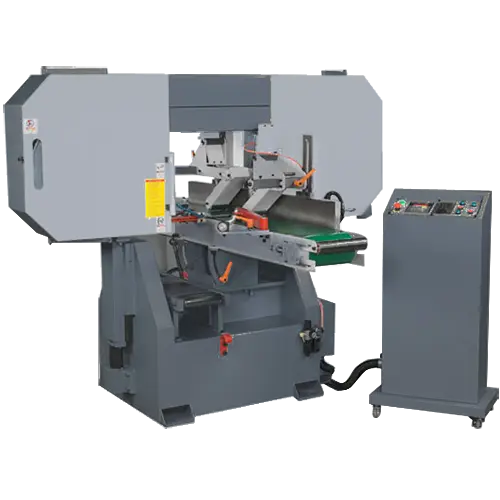 When the feed conveyor is tilted for bevel cutting a side support is applied for safe and stable cutting operations.