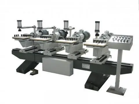 The MT-104 Horizontal Door Stile & Rail Boring Machine is designed to drill dowel holes in any door stile up to 10 ft. in length all at the same time. The heads can then be turned inward to drill the dowel holes in the rails. Stiles that are longer than 10 ft. may be drilled in sequential steps. The boring heads can be adjusted from left to right with a simple hand wheel turn that will accurately locate the drill heads at the desired spacing. Standard dowel drill bit diameters can be used with a 7/16"- 14" threaded shank. Changing the spacers on each table top will adjust for the thickness on a 2 ¼", 1 ¾" and 1 3/8" thick door stile or rail. The beds are designed to adjust for any thickness you desire up to 4 ½" to the center of the part. After completing the drilling on your stiles, you can change the position of any two heads to drill all the holes in the door rails at the same time. Each of the boring heads is controlled by a central control panel unit that is set on a movable stand for ease of operation. Each table has its own pneumatic hold down clamp that can be controlled individually or all together with the other clamps. The hold down clamps can be easily positioned over the material for the best results.