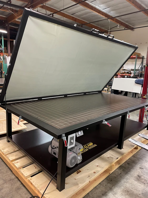 The SP Series has been the flagship vacuum press for Vac-U-Clamp for over 25 years. Made in the USA by American hands, this versatile vacuum press is well suited for any woodworking shop with vacuum laminating/forming and veneering applications. Designed with production, budget, durability and quality in mind, the S/P Series is made from TIG welded .125 & .250 industrial aluminum at our factory in San Diego County, California. Most popular sizes are 4×8 and 5×10 but available in 5×12 and larger if needed. Includes oil-cooled, rotary vane vacuum pump, silicon or poly membrane, baltic birch table platen & lower shelf, 12 hour timer, bleed system and vacuum gauge. Custom sizes are available also.