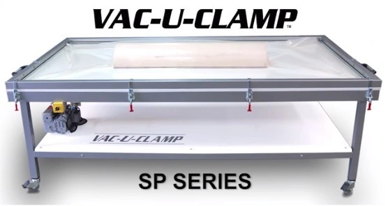 The SP Series has been the flagship vacuum press for Vac-U-Clamp for over 25 years. Made in the USA by American hands, this versatile vacuum press is well suited for any woodworking shop with vacuum laminating/forming and veneering applications. Designed with production, budget, durability and quality in mind, the S/P Series is made from TIG welded .125 & .250 industrial aluminum at our factory in San Diego County, California. Most popular sizes are 4×8 and 5×10 but available in 5×12 and larger if needed. Includes oil-cooled, rotary vane vacuum pump, silicon or poly membrane, baltic birch table platen & lower shelf, 12 hour timer, bleed system and vacuum gauge. Custom sizes are available also.