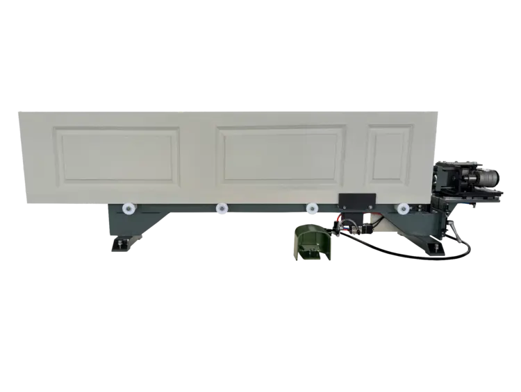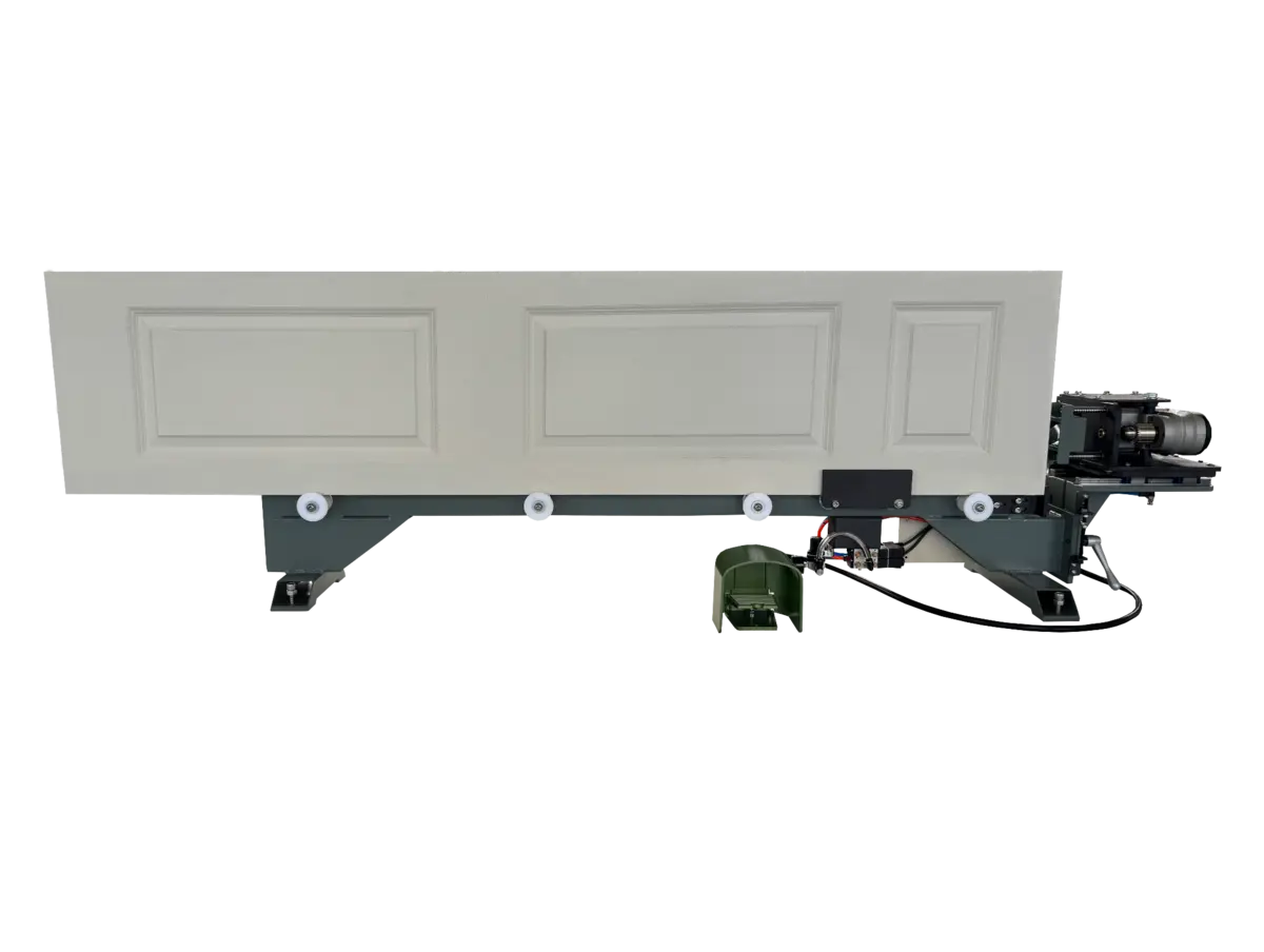 3. A pneumatic clamp activated by a foot pedal holds the door securely in place while drilling for the ball catch.